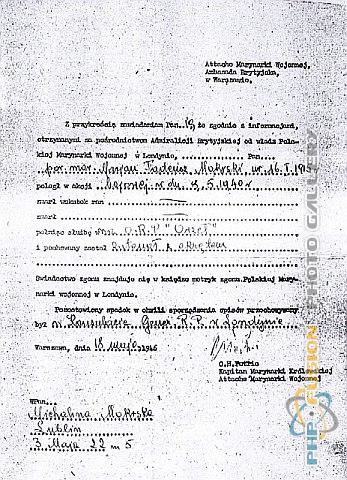 Zawiadomienie o śmierci syna, które dostała pani Michalina Mokrska od Attache Marynarki Wojennej Ambasady Brytyjskiej w Warszawie